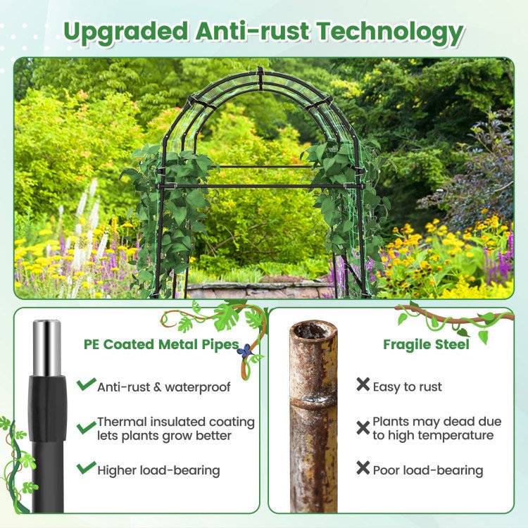 2.Rust-resistant and Robust Material: Made with PE coated metal pipes, the garden arch trellis guarantees lasting use without rusting or degradation. The metal pipes are fastened together by galvanized sure-clips, providing added structural strength for heavier plants to grow. Besides, the pipes comes with protective caps to prevent water ingress.