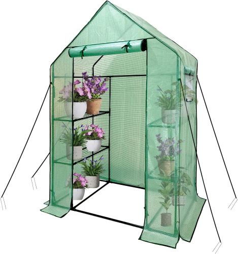 Do you want to care for plant growth all the season? Greenhouse kits for outdoors protects your plants from frost, excessive sun exposure, and also keeps the interior moist. Closing the roll up door of the green house can prevents small animals from damaging the plants. Relatively constant temperatures and moist conditions will allow plants to grow earlier and extend the growing season.This Mini Greenhouse provide the perfect solution for those smaller gardens that cannot accommodate a conventional greenhouse. It can protect your plants from too much heat or cold, shield plants from dust and gale, and help to keep out animal. It has a strong metal frame and green PE cover with zips for easy access and ventilation. Inside with shelves, ideal for pots and seed trays.Features:Material: Green PE Cover, Powder coated Metal TubeWeight Capacity: 17 lbs each shelfShelves: 3 Tier 6 Wired ShelvesThe roll-up door design is easy to access and take care of your plants. Opening the roll up door when the climate is suitable can also promote air circulation and plant growth in the greenhouseThe wired shelves are fully painted and welded to make the wire crisscross, which has superior rust proof and load-bearing capacity.Equipped with ground spikes, used with ropes to keep your greenhouse stable to protect your plants, seeds and flowers from the strong wind2 Velcro Side Windows for summer time ventilation and ObservationIndoor and Outdoor Greenhouse for Garden/Patio/Backyard/ BalconySpecification:Product Dimension: 55"(L) X 27.5"(W) x 78.7:(H)Door Dimensions: 34"(W) X 61"(H)Window Dimensions: 11.8"(W) X 11.8"(H)Package1 X Greenhouse for Outdoor.1 X InstructionTIPS:Suggest to use a rubber mallet to make sure all pipes joint tightly **suggest to put a heat lamp in it and stake it well when use in Winter